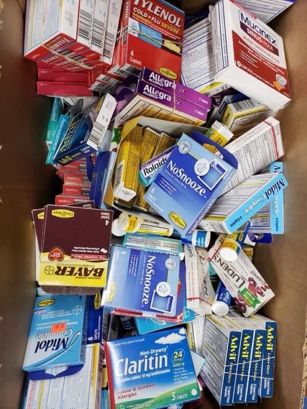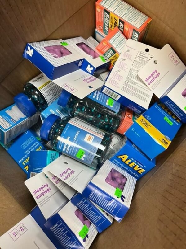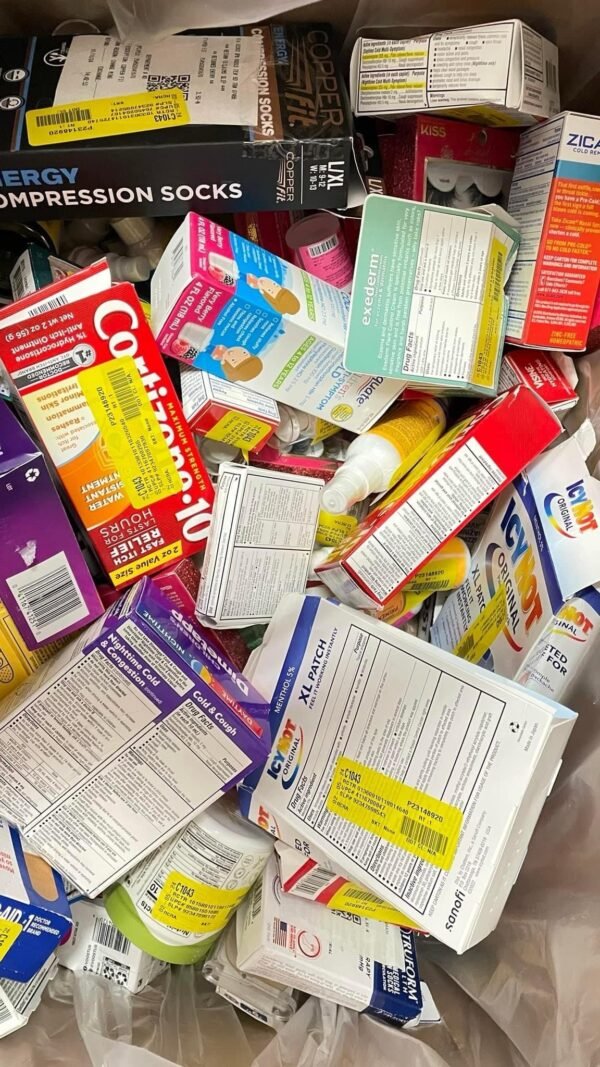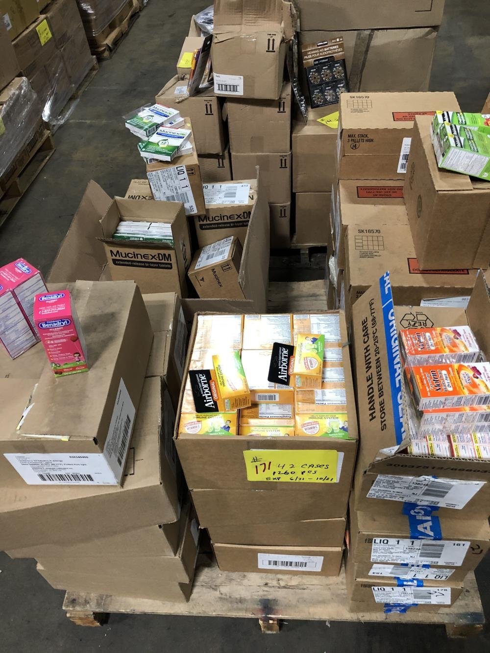 Each pallet includes 150–200 assorted OTC products – such as pain relief, cold & flu, allergy meds, vitamins, and supplements
